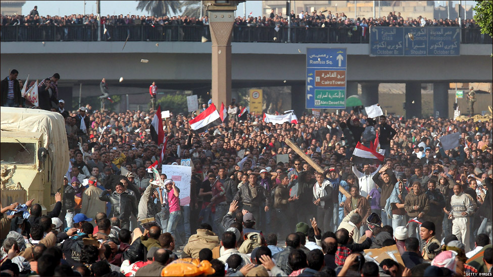 يوم الأربع ده الصبح نزلت أشترى حاجات فى مصر الجديدة ، لقيت مثلا شوية ناس فى الكوربة لابسين شيك ونظارات شمس ولاد وبنات شيلين صور حسنى مبارك وكاتبين كلام عن تأييده، طبعا من غير هتافات أو شعارات (يعنى كانت وقفة شيك) وعددهم ماكنش يكمل 20 أو 30 شخص وكانوا واقفين فى مكانهم مكتفين بأنهم يوروا الصور والكلام للناس اللى ماشية وراكبة السيارات. لم أعرهم أى إهتمام. لكن كان فيه أعداد كبيرة فى مصطفى محمود بتؤيد مبارك. وأنا راجع فى العربية سمعت فى الراديو بيقول “أنباء” عن إحتكاكات بين مؤيدين الرئيس ومعارضيه. ولما رجعت البيت شفنا بداية الإحتكاكات فى التليفزيون وبعدين مهزلة الحصنه والجمال وبعد كده بقى المعركة الحقيقية بين الطرفين بالحجارة والمولوتوف لغاية الصبح، وصور القناصة وهى بتضرب نار من فوق العمارات (وملوتوف برضه) طبعنا كلنا فاكرين لما كانت قنوات الأخبار فى العالم كله كانت شغالة 24 ساعة على ميدان التحرير فقط. طبعا كانت حاجة غبية تدل على إن اللى خطط لها متخلف وجاهل وغبى وحمار إنه يأجر بلطجية علشان يمثلوا تأييد حسنى مبارك ويضرب الناس بالحجارة والملوتوف والسكاكين والرصاص و “الجمال” . بصراحة مش راكبة على بعض إن المؤيدين لمبارك والداعيين “للإستقرار” يعملوا الحاجات الهمجية دى. لدرجة إن فيه بعض المدرعات وصلها الحرق والتدمير.